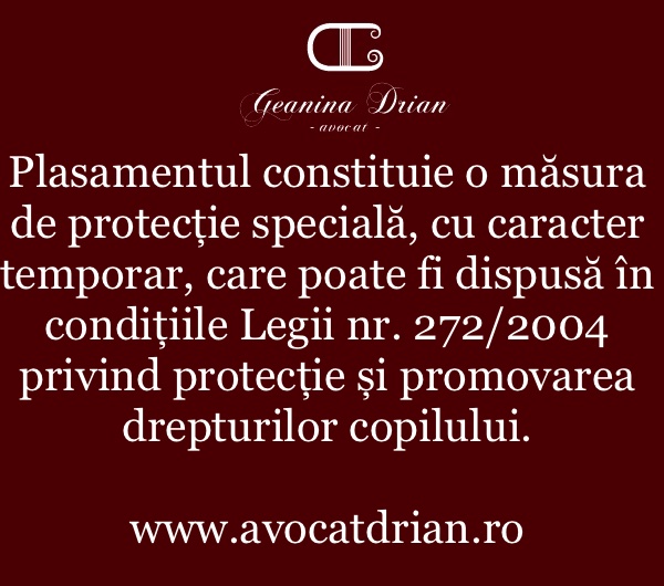 Prin plasament înțelegem măsura de protecție specială, cu caracter temporar, care poate fi dispusă în condițiile Legii nr. 272/2004 privind protecție și promovarea drepturilor copilului.