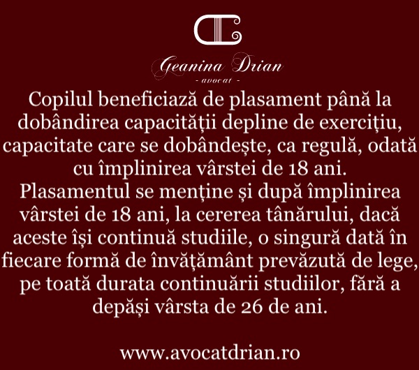 Copilul beneficiază de plasament până la dobândirea capacității depline de exercițiu, capacitate care se dobândește, ca regulă, odată cu împlinirea vârstei de 18 ani.