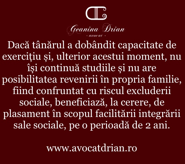 Dacă, tânărul a dobândit capacitate de exercițiu și, ulterior acestui moment, nu își continuă studiile și nu are posibilitatea revenirii în propria familie, fiind confruntat cu riscul excluderii sociale, beneficiază, la cerere, de plasament în scopul facilitării integrării sale sociale, pe o perioadă de 2 ani.