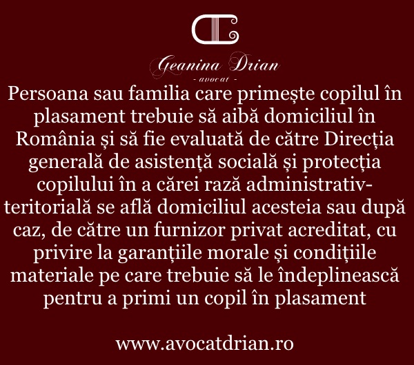 Persoana sau familia care primește un copil în plasament trebuie să aibă domiciliul în România și să fie evaluată de către direcția generală de asistență socială și protecția copilului în a cărei rază administrativ-teritorială se află domiciliul acesteia sau, după caz, de către un furnizor privat acreditat, cu privire la garanțiile morale și condițiile materiale pe care trebuie să le îndeplinească pentru a primi un copil în plasament. Persoana sau familia poate primi în plasament și un copil care are domiciliul în altă unitate administrativ-teritorială, dacă interesul superior al copilului o impune.