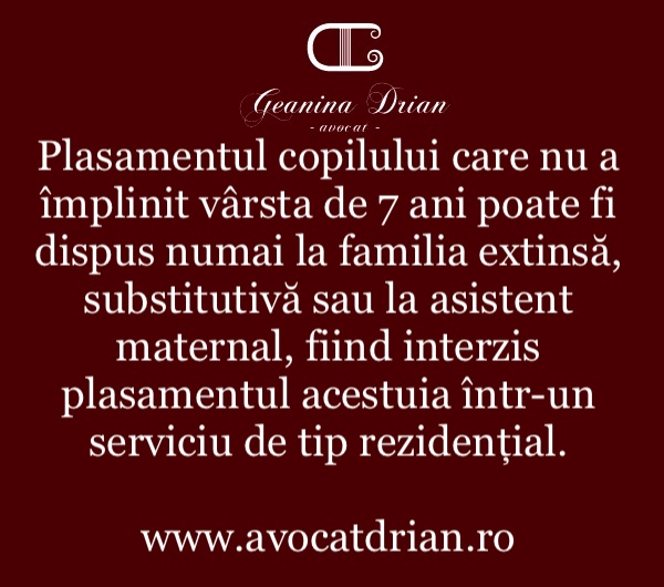 Potrivit art. 64 din Legea nr. 272/2004, plasamentul copilului care nu a împlinit vârsta de 7 ani poate fi dispus numai la familia extinsă, substitutivă sau la asistent maternal, fiind interzis plasamentul acestuia într-un serviciu de tip rezidențial.