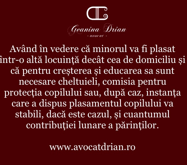 Având în vedere faptul că minorul va fi plasat într-o altă locuință decât cea de domiciliu și că pentru creșterea și educarea sa sunt necesare cheltuieli, comisia pentru protecția copilului sau, după caz, instanța care a dispus măsura de plasament pentru copil va stabili, dacă este cazul, și cuantumul contribuției lunare a părinților.